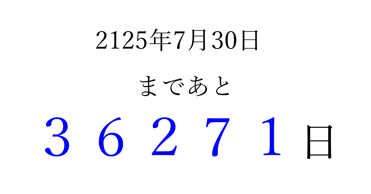 2125年7月30日(月)まで あと 99999 日です 追加すると、トップページからすぐ選べるようになります ※2026/04/09現在の結果です。 最新の状態に更新する ↓シェアして、タイムライン上にカウントダウンを表示しよう!↓ 📤 この結果を共有する Tweet シェア Threads Bluesky 別の日付でカウントダウン 2125年7月のカレンダー このページをブックマークに追加すると、いつでもカウントダウンを確認できます。 (PC: Ctrl+D / Mac: ⌘+D) hitome-notes.comでは以下のページも運営しています。 指定日と期間から日付を計算 | ガチャ確率計算・シミュレーション | プライバシー・ポリシー 運営者:Avocado