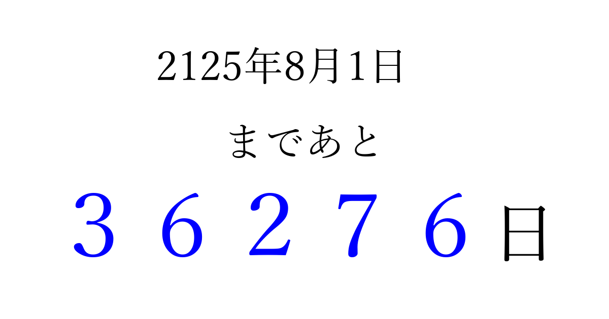 2125年8月1日(水)まで あと 99999 日です 追加すると、トップページからすぐ選べるようになります ※2026/04/06現在の結果です。 最新の状態に更新する ↓シェアして、タイムライン上にカウントダウンを表示しよう!↓ 📤 この結果を共有する Tweet シェア Threads Bluesky 別の日付でカウントダウン 2125年8月のカレンダー このページをブックマークに追加すると、いつでもカウントダウンを確認できます。 (PC: Ctrl+D / Mac: ⌘+D) hitome-notes.comでは以下のページも運営しています。 指定日と期間から日付を計算 | ガチャ確率計算・シミュレーション | プライバシー・ポリシー 運営者:Avocado
