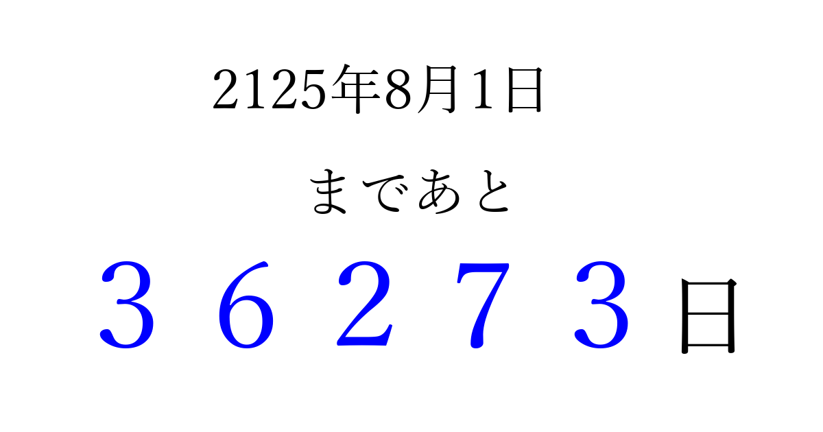2125年8月1日(水)まで あと 99999 日です 追加すると、トップページからすぐ選べるようになります ※2026/04/09現在の結果です。 最新の状態に更新する ↓シェアして、タイムライン上にカウントダウンを表示しよう!↓ 📤 この結果を共有する Tweet シェア Threads Bluesky 別の日付でカウントダウン 2125年8月のカレンダー このページをブックマークに追加すると、いつでもカウントダウンを確認できます。 (PC: Ctrl+D / Mac: ⌘+D) hitome-notes.comでは以下のページも運営しています。 指定日と期間から日付を計算 | ガチャ確率計算・シミュレーション | プライバシー・ポリシー 運営者:Avocado