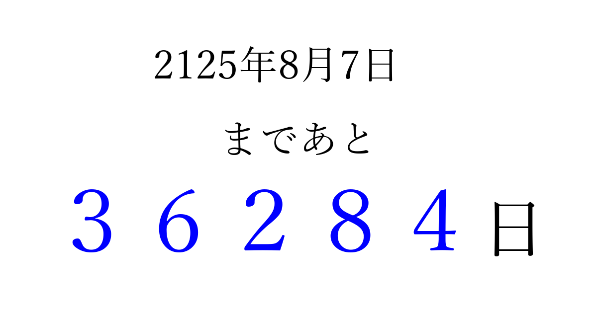 2125年8月7日(火)まで あと 99999 日です 追加すると、トップページからすぐ選べるようになります ※2026/04/04現在の結果です。 最新の状態に更新する ↓シェアして、タイムライン上にカウントダウンを表示しよう!↓ 📤 この結果を共有する Tweet シェア Threads Bluesky 別の日付でカウントダウン 2125年8月のカレンダー このページをブックマークに追加すると、いつでもカウントダウンを確認できます。 (PC: Ctrl+D / Mac: ⌘+D) hitome-notes.comでは以下のページも運営しています。 指定日と期間から日付を計算 | ガチャ確率計算・シミュレーション | プライバシー・ポリシー 運営者:Avocado