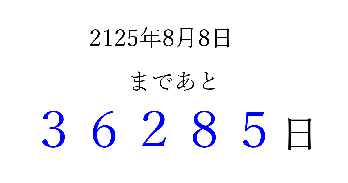 2125年8月8日(水)まで あと 99999 日です 追加すると、トップページからすぐ選べるようになります ※2026/04/04現在の結果です。 最新の状態に更新する ↓シェアして、タイムライン上にカウントダウンを表示しよう!↓ 📤 この結果を共有する Tweet シェア Threads Bluesky 別の日付でカウントダウン 2125年8月のカレンダー このページをブックマークに追加すると、いつでもカウントダウンを確認できます。 (PC: Ctrl+D / Mac: ⌘+D) hitome-notes.comでは以下のページも運営しています。 指定日と期間から日付を計算 | ガチャ確率計算・シミュレーション | プライバシー・ポリシー 運営者:Avocado