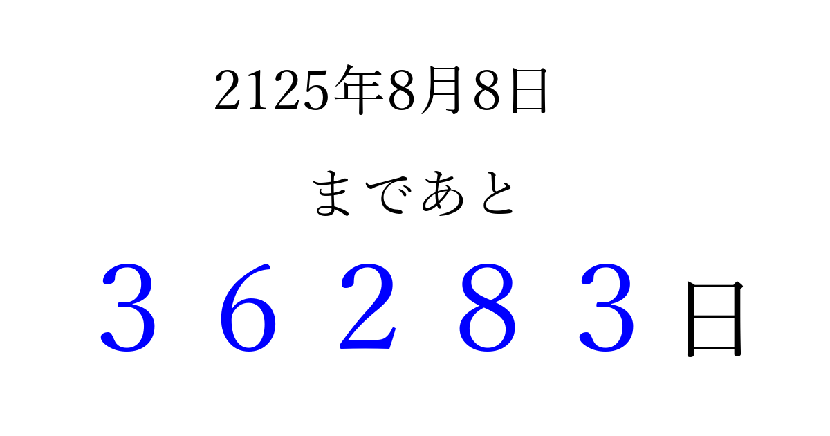 2125年8月8日(水)まで あと 99999 日です 追加すると、トップページからすぐ選べるようになります ※2026/04/06現在の結果です。 最新の状態に更新する ↓シェアして、タイムライン上にカウントダウンを表示しよう!↓ 📤 この結果を共有する Tweet シェア Threads Bluesky 別の日付でカウントダウン 2125年8月のカレンダー このページをブックマークに追加すると、いつでもカウントダウンを確認できます。 (PC: Ctrl+D / Mac: ⌘+D) hitome-notes.comでは以下のページも運営しています。 指定日と期間から日付を計算 | ガチャ確率計算・シミュレーション | プライバシー・ポリシー 運営者:Avocado