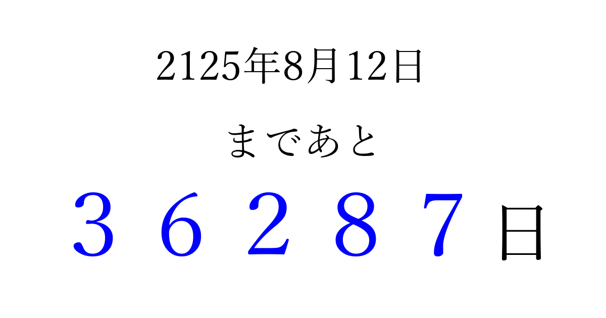 2125年8月12日(日)まで あと 99999 日です 追加すると、トップページからすぐ選べるようになります ※2026/04/06現在の結果です。 最新の状態に更新する ↓シェアして、タイムライン上にカウントダウンを表示しよう!↓ 📤 この結果を共有する Tweet シェア Threads Bluesky 別の日付でカウントダウン 2125年8月のカレンダー このページをブックマークに追加すると、いつでもカウントダウンを確認できます。 (PC: Ctrl+D / Mac: ⌘+D) hitome-notes.comでは以下のページも運営しています。 指定日と期間から日付を計算 | ガチャ確率計算・シミュレーション | プライバシー・ポリシー 運営者:Avocado