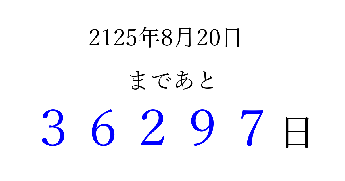 2125年8月20日(月)まで あと 99999 日です 追加すると、トップページからすぐ選べるようになります ※2026/04/04現在の結果です。 最新の状態に更新する ↓シェアして、タイムライン上にカウントダウンを表示しよう!↓ 📤 この結果を共有する Tweet シェア Threads Bluesky 別の日付でカウントダウン 2125年8月のカレンダー このページをブックマークに追加すると、いつでもカウントダウンを確認できます。 (PC: Ctrl+D / Mac: ⌘+D) hitome-notes.comでは以下のページも運営しています。 指定日と期間から日付を計算 | ガチャ確率計算・シミュレーション | プライバシー・ポリシー 運営者:Avocado