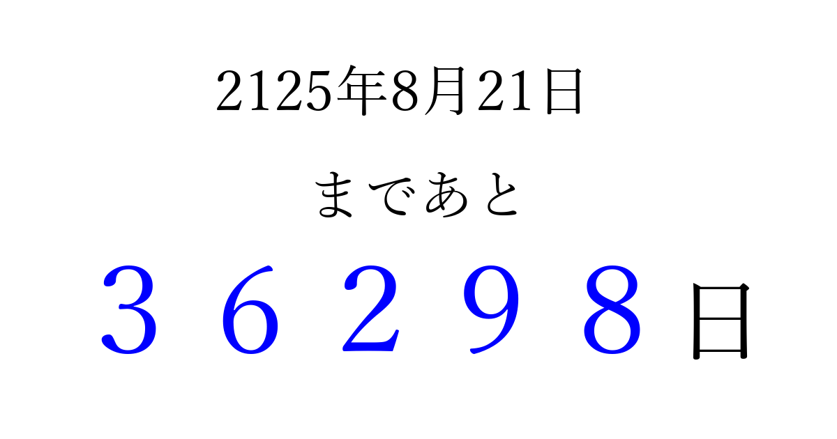 2125年8月21日(火)まで あと 99999 日です 追加すると、トップページからすぐ選べるようになります ※2026/04/04現在の結果です。 最新の状態に更新する ↓シェアして、タイムライン上にカウントダウンを表示しよう!↓ 📤 この結果を共有する Tweet シェア Threads Bluesky 別の日付でカウントダウン 2125年8月のカレンダー このページをブックマークに追加すると、いつでもカウントダウンを確認できます。 (PC: Ctrl+D / Mac: ⌘+D) hitome-notes.comでは以下のページも運営しています。 指定日と期間から日付を計算 | ガチャ確率計算・シミュレーション | プライバシー・ポリシー 運営者:Avocado