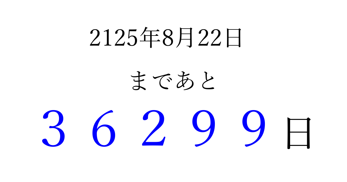 2125年8月22日(水)まで あと 99999 日です 追加すると、トップページからすぐ選べるようになります ※2026/04/04現在の結果です。 最新の状態に更新する ↓シェアして、タイムライン上にカウントダウンを表示しよう!↓ 📤 この結果を共有する Tweet シェア Threads Bluesky 別の日付でカウントダウン 2125年8月のカレンダー このページをブックマークに追加すると、いつでもカウントダウンを確認できます。 (PC: Ctrl+D / Mac: ⌘+D) hitome-notes.comでは以下のページも運営しています。 指定日と期間から日付を計算 | ガチャ確率計算・シミュレーション | プライバシー・ポリシー 運営者:Avocado