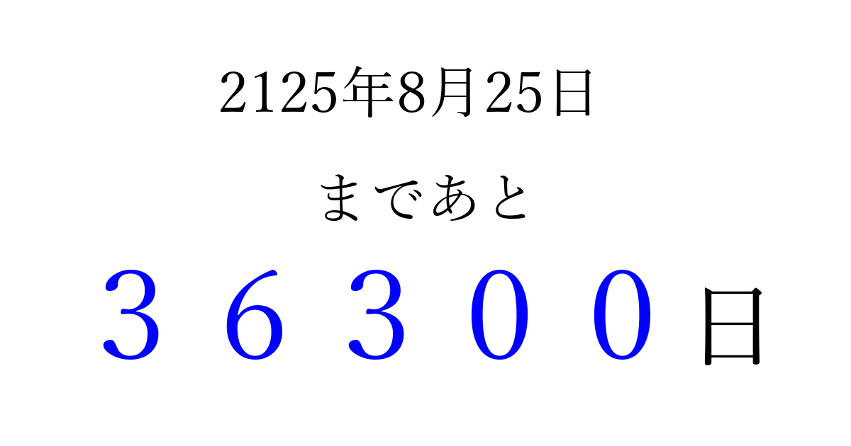 2125年8月25日(土)まで あと 99999 日です 追加すると、トップページからすぐ選べるようになります ※2026/04/06現在の結果です。 最新の状態に更新する ↓シェアして、タイムライン上にカウントダウンを表示しよう!↓ 📤 この結果を共有する Tweet シェア Threads Bluesky 別の日付でカウントダウン 2125年8月のカレンダー このページをブックマークに追加すると、いつでもカウントダウンを確認できます。 (PC: Ctrl+D / Mac: ⌘+D) hitome-notes.comでは以下のページも運営しています。 指定日と期間から日付を計算 | ガチャ確率計算・シミュレーション | プライバシー・ポリシー 運営者:Avocado
