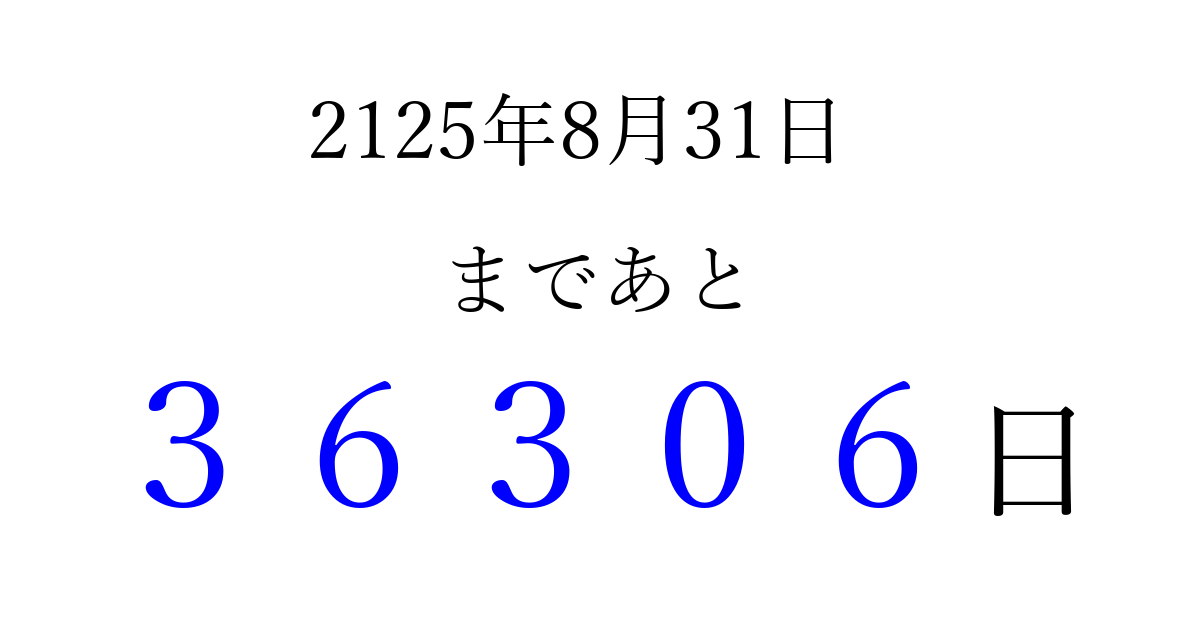 2125年8月31日(金)まで あと 99999 日です 追加すると、トップページからすぐ選べるようになります ※2026/04/06現在の結果です。 最新の状態に更新する ↓シェアして、タイムライン上にカウントダウンを表示しよう!↓ 📤 この結果を共有する Tweet シェア Threads Bluesky 別の日付でカウントダウン 2125年8月のカレンダー このページをブックマークに追加すると、いつでもカウントダウンを確認できます。 (PC: Ctrl+D / Mac: ⌘+D) hitome-notes.comでは以下のページも運営しています。 指定日と期間から日付を計算 | ガチャ確率計算・シミュレーション | プライバシー・ポリシー 運営者:Avocado