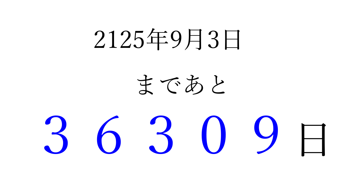 2125年9月3日(月)まで あと 99999 日です 追加すると、トップページからすぐ選べるようになります ※2026/04/06現在の結果です。 最新の状態に更新する ↓シェアして、タイムライン上にカウントダウンを表示しよう!↓ 📤 この結果を共有する Tweet シェア Threads Bluesky 別の日付でカウントダウン 2125年9月のカレンダー このページをブックマークに追加すると、いつでもカウントダウンを確認できます。 (PC: Ctrl+D / Mac: ⌘+D) hitome-notes.comでは以下のページも運営しています。 指定日と期間から日付を計算 | ガチャ確率計算・シミュレーション | プライバシー・ポリシー 運営者:Avocado