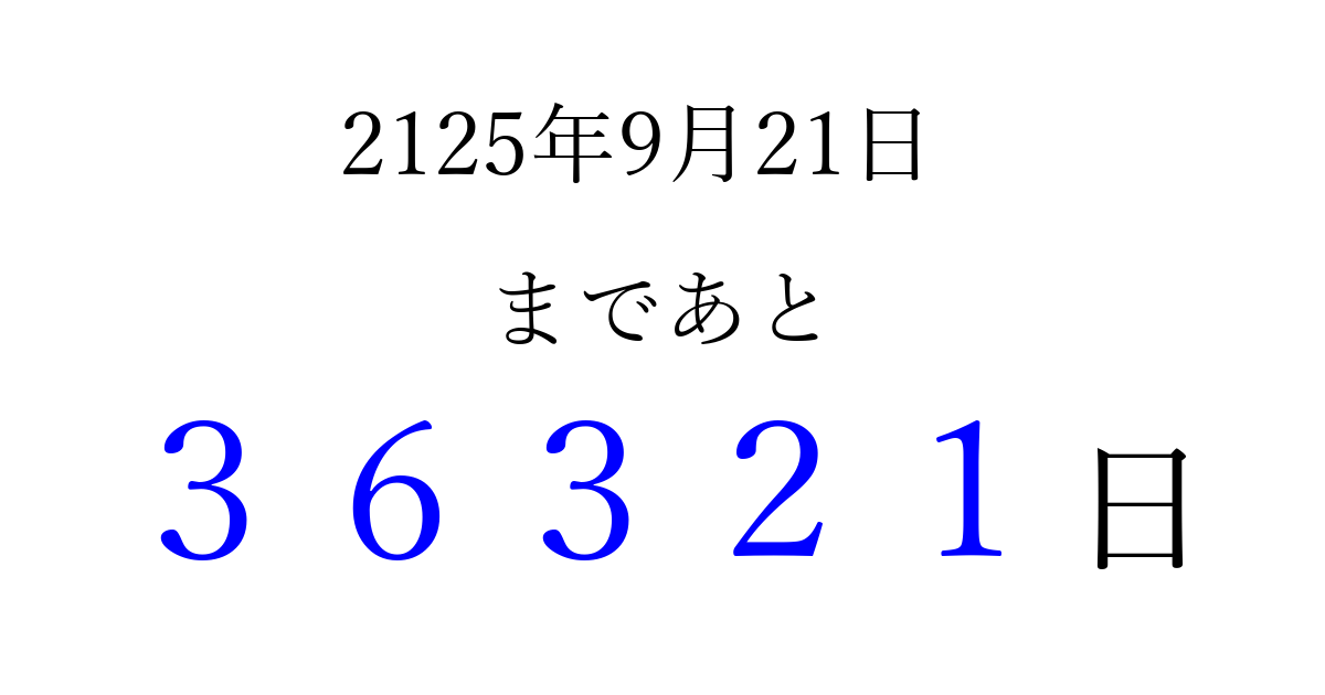 2125年9月21日(金)まで あと 99999 日です 追加すると、トップページからすぐ選べるようになります ※2026/04/12現在の結果です。 最新の状態に更新する ↓シェアして、タイムライン上にカウントダウンを表示しよう!↓ 📤 この結果を共有する Tweet シェア Threads Bluesky 別の日付でカウントダウン 2125年9月のカレンダー このページをブックマークに追加すると、いつでもカウントダウンを確認できます。 (PC: Ctrl+D / Mac: ⌘+D) hitome-notes.comでは以下のページも運営しています。 指定日と期間から日付を計算 | ガチャ確率計算・シミュレーション | プライバシー・ポリシー 運営者:Avocado