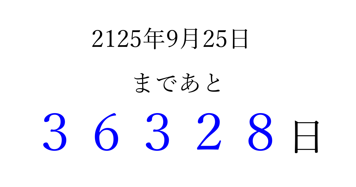 2125年9月25日(火)まで あと 99999 日です 追加すると、トップページからすぐ選べるようになります ※2026/04/09現在の結果です。 最新の状態に更新する ↓シェアして、タイムライン上にカウントダウンを表示しよう!↓ 📤 この結果を共有する Tweet シェア Threads Bluesky 別の日付でカウントダウン 2125年9月のカレンダー このページをブックマークに追加すると、いつでもカウントダウンを確認できます。 (PC: Ctrl+D / Mac: ⌘+D) hitome-notes.comでは以下のページも運営しています。 指定日と期間から日付を計算 | ガチャ確率計算・シミュレーション | プライバシー・ポリシー 運営者:Avocado
