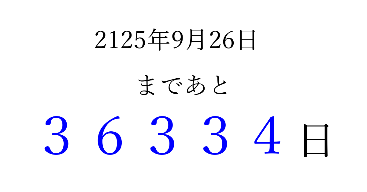 2125年9月26日(水)まで あと 99999 日です 追加すると、トップページからすぐ選べるようになります ※2026/04/04現在の結果です。 最新の状態に更新する ↓シェアして、タイムライン上にカウントダウンを表示しよう!↓ 📤 この結果を共有する Tweet シェア Threads Bluesky 別の日付でカウントダウン 2125年9月のカレンダー このページをブックマークに追加すると、いつでもカウントダウンを確認できます。 (PC: Ctrl+D / Mac: ⌘+D) hitome-notes.comでは以下のページも運営しています。 指定日と期間から日付を計算 | ガチャ確率計算・シミュレーション | プライバシー・ポリシー 運営者:Avocado