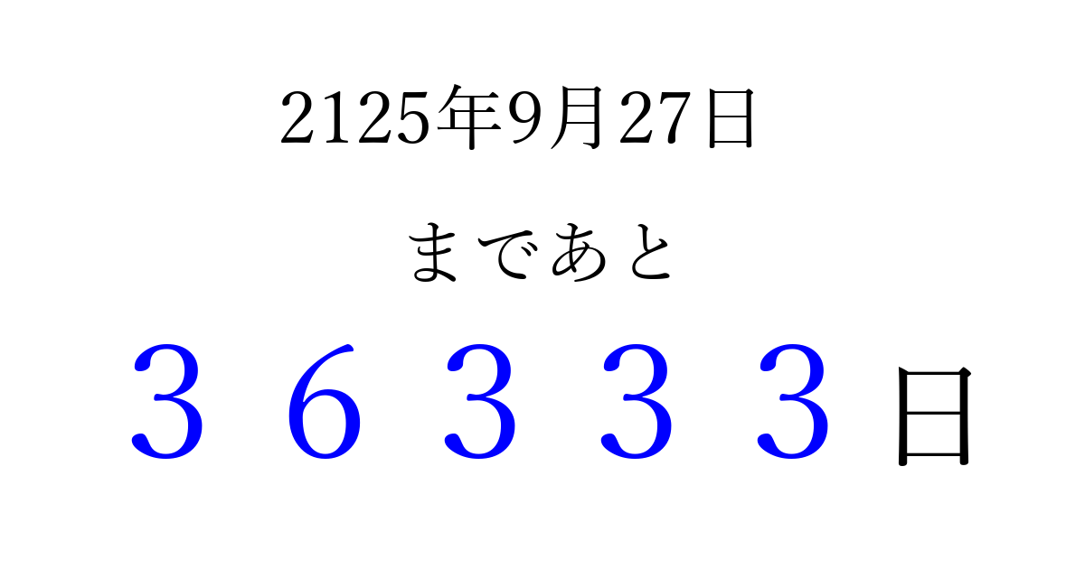 2125年9月27日(木)まで あと 99999 日です 追加すると、トップページからすぐ選べるようになります ※2026/04/06現在の結果です。 最新の状態に更新する ↓シェアして、タイムライン上にカウントダウンを表示しよう!↓ 📤 この結果を共有する Tweet シェア Threads Bluesky 別の日付でカウントダウン 2125年9月のカレンダー このページをブックマークに追加すると、いつでもカウントダウンを確認できます。 (PC: Ctrl+D / Mac: ⌘+D) hitome-notes.comでは以下のページも運営しています。 指定日と期間から日付を計算 | ガチャ確率計算・シミュレーション | プライバシー・ポリシー 運営者:Avocado
