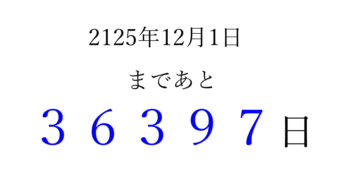2125年12月1日(土)まで あと 99999 日です 追加すると、トップページからすぐ選べるようになります ※2026/04/07現在の結果です。 最新の状態に更新する ↓シェアして、タイムライン上にカウントダウンを表示しよう!↓ 📤 この結果を共有する Tweet シェア Threads Bluesky 別の日付でカウントダウン 2125年12月のカレンダー このページをブックマークに追加すると、いつでもカウントダウンを確認できます。 (PC: Ctrl+D / Mac: ⌘+D) hitome-notes.comでは以下のページも運営しています。 指定日と期間から日付を計算 | ガチャ確率計算・シミュレーション | プライバシー・ポリシー 運営者:Avocado