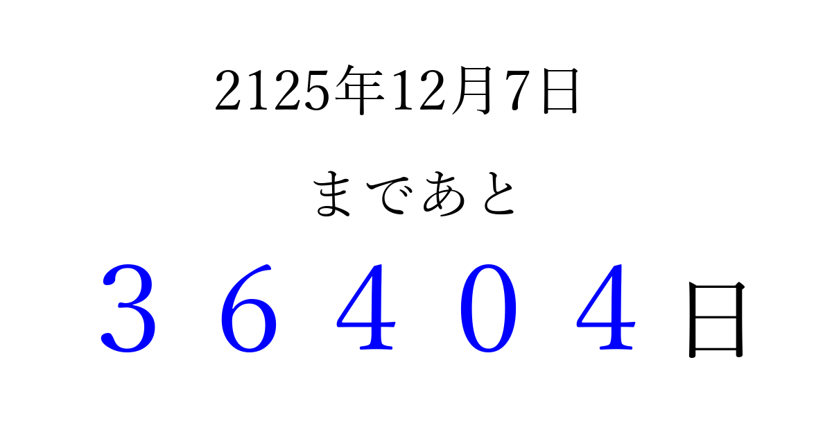 2125年12月7日(金)まで あと 99999 日です 追加すると、トップページからすぐ選べるようになります ※2026/04/06現在の結果です。 最新の状態に更新する ↓シェアして、タイムライン上にカウントダウンを表示しよう!↓ 📤 この結果を共有する Tweet シェア Threads Bluesky 別の日付でカウントダウン 2125年12月のカレンダー このページをブックマークに追加すると、いつでもカウントダウンを確認できます。 (PC: Ctrl+D / Mac: ⌘+D) hitome-notes.comでは以下のページも運営しています。 指定日と期間から日付を計算 | ガチャ確率計算・シミュレーション | プライバシー・ポリシー 運営者:Avocado