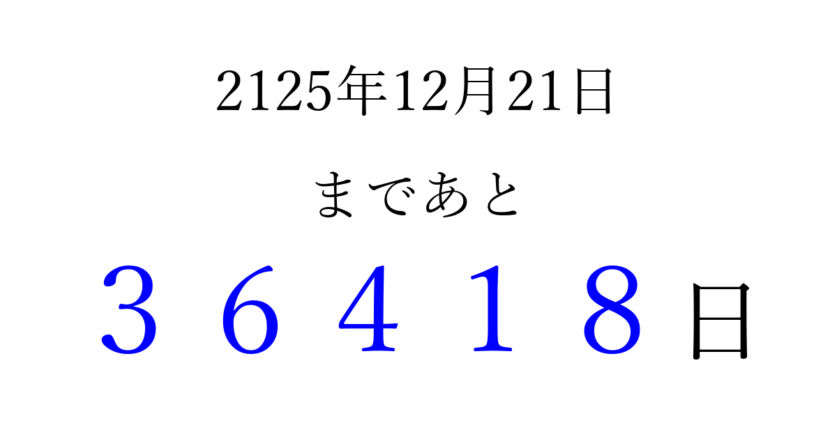 2125年12月21日(金)まで あと 99999 日です 追加すると、トップページからすぐ選べるようになります ※2026/04/06現在の結果です。 最新の状態に更新する ↓シェアして、タイムライン上にカウントダウンを表示しよう!↓ 📤 この結果を共有する Tweet シェア Threads Bluesky 別の日付でカウントダウン 2125年12月のカレンダー このページをブックマークに追加すると、いつでもカウントダウンを確認できます。 (PC: Ctrl+D / Mac: ⌘+D) hitome-notes.comでは以下のページも運営しています。 指定日と期間から日付を計算 | ガチャ確率計算・シミュレーション | プライバシー・ポリシー 運営者:Avocado
