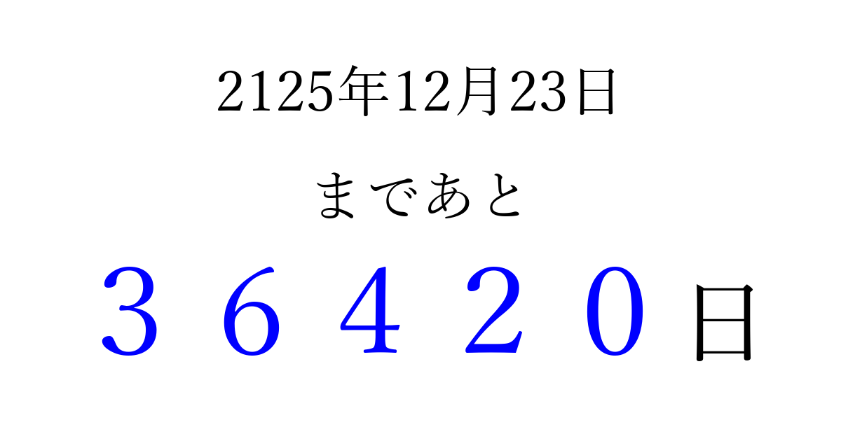 2125年12月23日(日)まで あと 99999 日です 追加すると、トップページからすぐ選べるようになります ※2026/04/06現在の結果です。 最新の状態に更新する ↓シェアして、タイムライン上にカウントダウンを表示しよう!↓ 📤 この結果を共有する Tweet シェア Threads Bluesky 別の日付でカウントダウン 2125年12月のカレンダー このページをブックマークに追加すると、いつでもカウントダウンを確認できます。 (PC: Ctrl+D / Mac: ⌘+D) hitome-notes.comでは以下のページも運営しています。 指定日と期間から日付を計算 | ガチャ確率計算・シミュレーション | プライバシー・ポリシー 運営者:Avocado