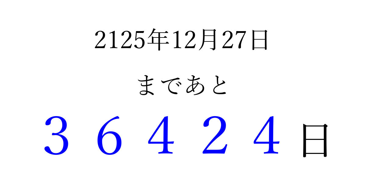 2125年12月27日(木)まで あと 99999 日です 追加すると、トップページからすぐ選べるようになります ※2026/04/06現在の結果です。 最新の状態に更新する ↓シェアして、タイムライン上にカウントダウンを表示しよう!↓ 📤 この結果を共有する Tweet シェア Threads Bluesky 別の日付でカウントダウン 2125年12月のカレンダー このページをブックマークに追加すると、いつでもカウントダウンを確認できます。 (PC: Ctrl+D / Mac: ⌘+D) hitome-notes.comでは以下のページも運営しています。 指定日と期間から日付を計算 | ガチャ確率計算・シミュレーション | プライバシー・ポリシー 運営者:Avocado