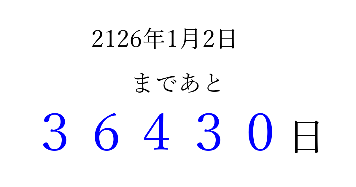 2126年1月2日(水)まで あと 99999 日です 追加すると、トップページからすぐ選べるようになります ※2026/04/06現在の結果です。 最新の状態に更新する ↓シェアして、タイムライン上にカウントダウンを表示しよう!↓ 📤 この結果を共有する Tweet シェア Threads Bluesky 別の日付でカウントダウン 2126年1月のカレンダー このページをブックマークに追加すると、いつでもカウントダウンを確認できます。 (PC: Ctrl+D / Mac: ⌘+D) hitome-notes.comでは以下のページも運営しています。 指定日と期間から日付を計算 | ガチャ確率計算・シミュレーション | プライバシー・ポリシー 運営者:Avocado