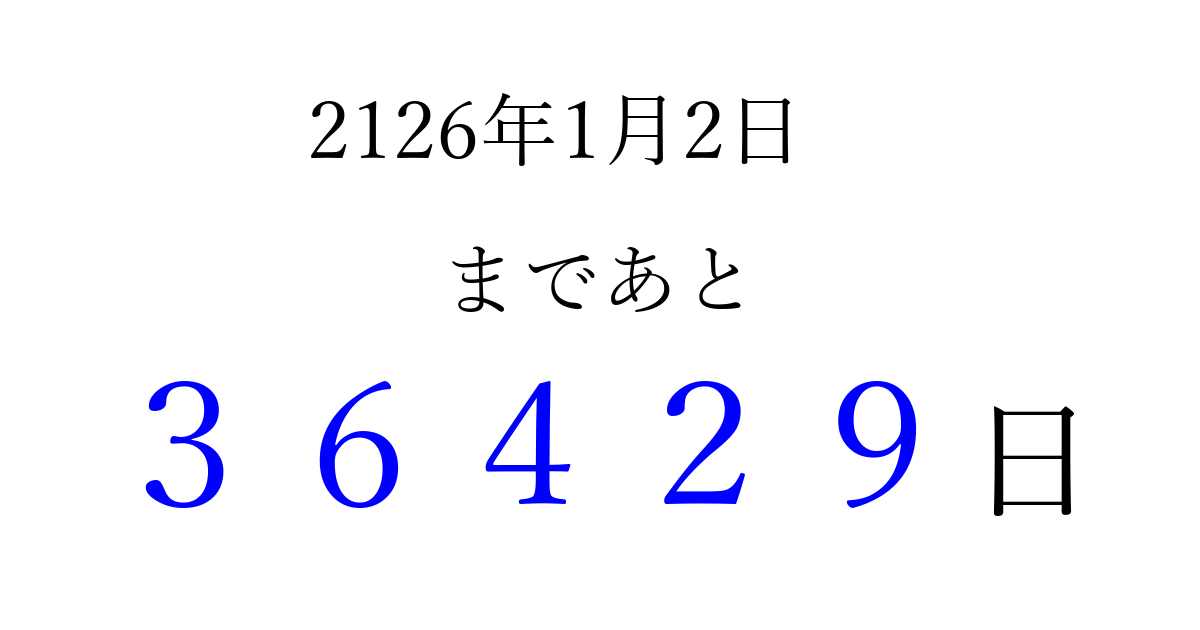 2126年1月2日(水)まで あと 99999 日です 追加すると、トップページからすぐ選べるようになります ※2026/04/07現在の結果です。 最新の状態に更新する ↓シェアして、タイムライン上にカウントダウンを表示しよう!↓ 📤 この結果を共有する Tweet シェア Threads Bluesky 別の日付でカウントダウン 2126年1月のカレンダー このページをブックマークに追加すると、いつでもカウントダウンを確認できます。 (PC: Ctrl+D / Mac: ⌘+D) hitome-notes.comでは以下のページも運営しています。 指定日と期間から日付を計算 | ガチャ確率計算・シミュレーション | プライバシー・ポリシー 運営者:Avocado