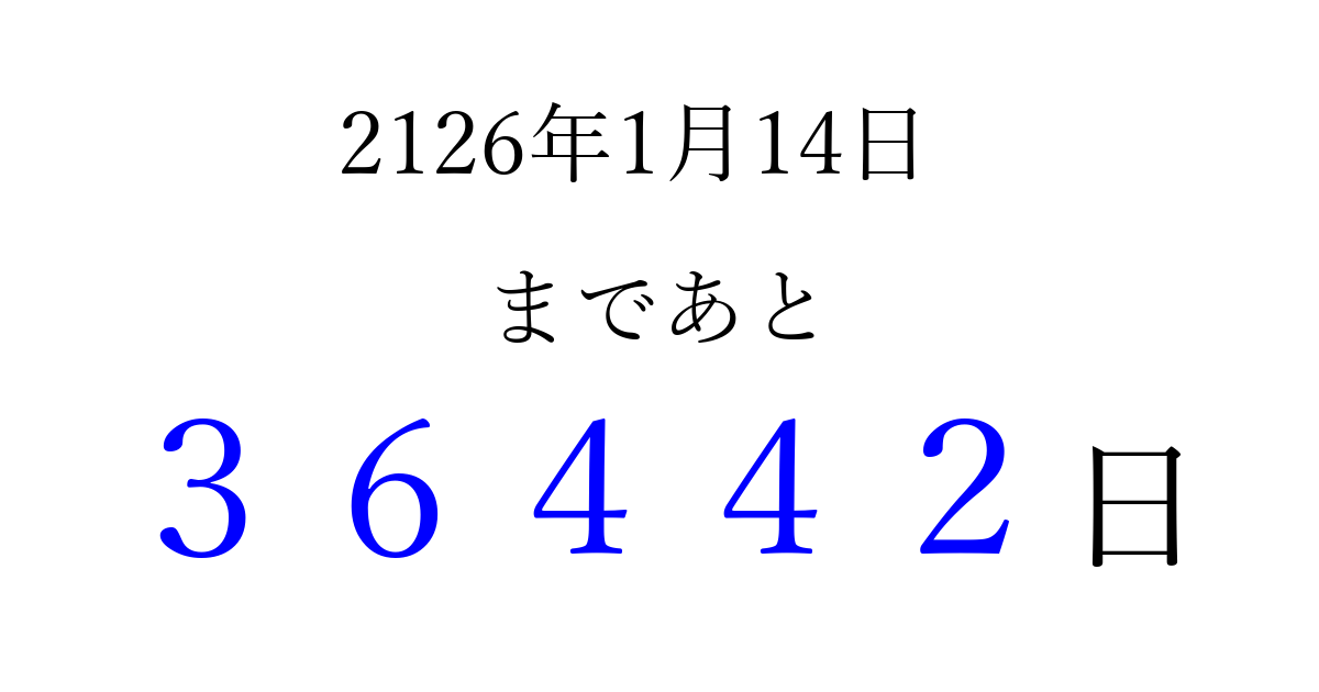 2126年1月14日(月)まで あと 99999 日です 追加すると、トップページからすぐ選べるようになります ※2026/04/06現在の結果です。 最新の状態に更新する ↓シェアして、タイムライン上にカウントダウンを表示しよう!↓ 📤 この結果を共有する Tweet シェア Threads Bluesky 別の日付でカウントダウン 2126年1月のカレンダー このページをブックマークに追加すると、いつでもカウントダウンを確認できます。 (PC: Ctrl+D / Mac: ⌘+D) hitome-notes.comでは以下のページも運営しています。 指定日と期間から日付を計算 | ガチャ確率計算・シミュレーション | プライバシー・ポリシー 運営者:Avocado