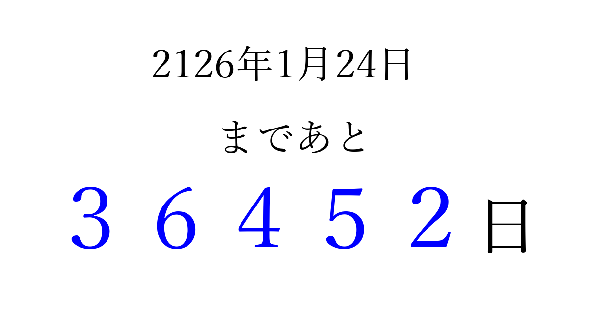 2126年1月24日(木)まで あと 99999 日です 追加すると、トップページからすぐ選べるようになります ※2026/04/06現在の結果です。 最新の状態に更新する ↓シェアして、タイムライン上にカウントダウンを表示しよう!↓ 📤 この結果を共有する Tweet シェア Threads Bluesky 別の日付でカウントダウン 2126年1月のカレンダー このページをブックマークに追加すると、いつでもカウントダウンを確認できます。 (PC: Ctrl+D / Mac: ⌘+D) hitome-notes.comでは以下のページも運営しています。 指定日と期間から日付を計算 | ガチャ確率計算・シミュレーション | プライバシー・ポリシー 運営者:Avocado