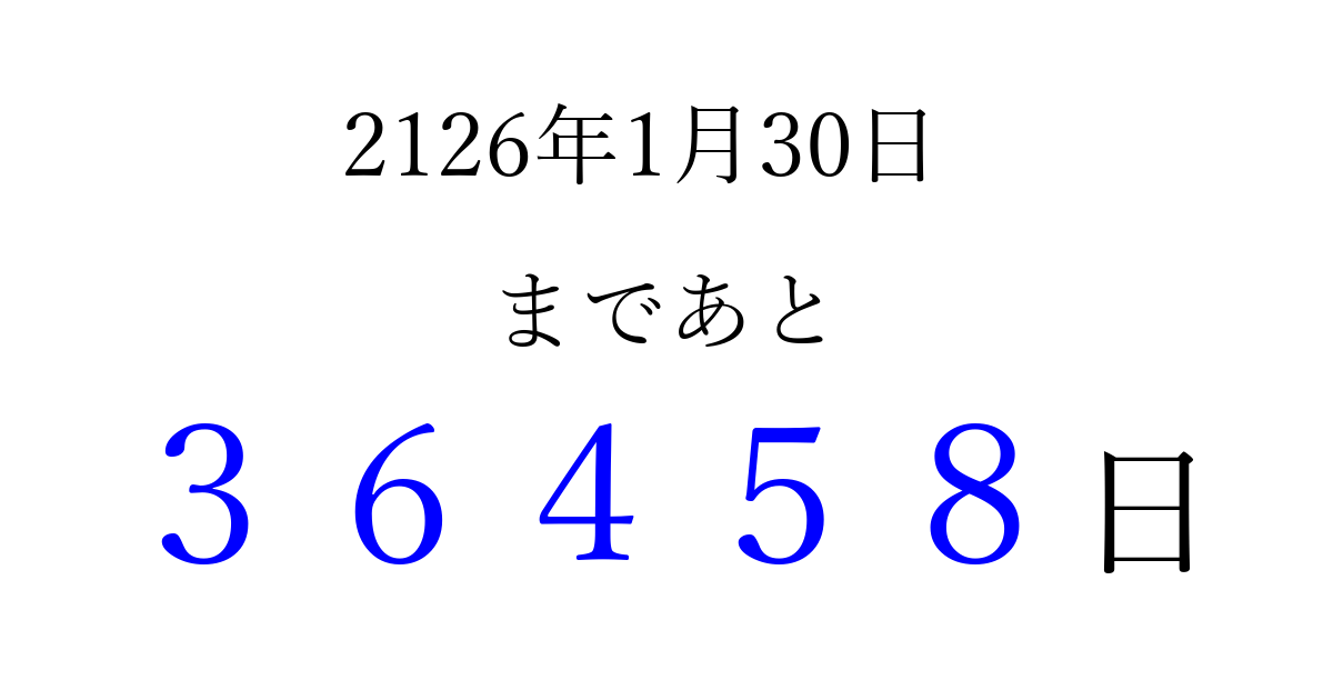 2126年1月30日(水)まで あと 99999 日です 追加すると、トップページからすぐ選べるようになります ※2026/04/06現在の結果です。 最新の状態に更新する ↓シェアして、タイムライン上にカウントダウンを表示しよう!↓ 📤 この結果を共有する Tweet シェア Threads Bluesky 別の日付でカウントダウン 2126年1月のカレンダー このページをブックマークに追加すると、いつでもカウントダウンを確認できます。 (PC: Ctrl+D / Mac: ⌘+D) hitome-notes.comでは以下のページも運営しています。 指定日と期間から日付を計算 | ガチャ確率計算・シミュレーション | プライバシー・ポリシー 運営者:Avocado