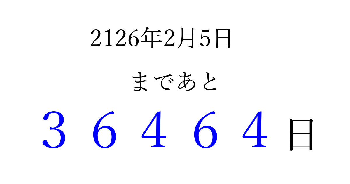 2126年2月5日(火)まで あと 99999 日です 追加すると、トップページからすぐ選べるようになります ※2026/04/06現在の結果です。 最新の状態に更新する ↓シェアして、タイムライン上にカウントダウンを表示しよう!↓ 📤 この結果を共有する Tweet シェア Threads Bluesky 別の日付でカウントダウン 2126年2月のカレンダー このページをブックマークに追加すると、いつでもカウントダウンを確認できます。 (PC: Ctrl+D / Mac: ⌘+D) hitome-notes.comでは以下のページも運営しています。 指定日と期間から日付を計算 | ガチャ確率計算・シミュレーション | プライバシー・ポリシー 運営者:Avocado