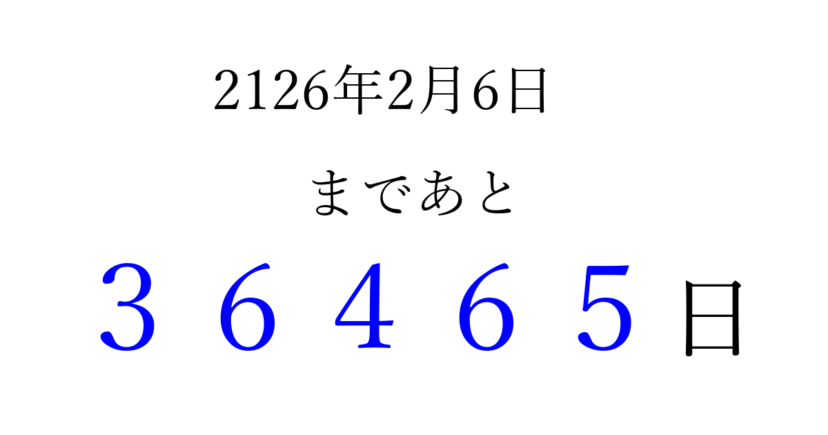 2126年2月6日(水)まで あと 99999 日です 追加すると、トップページからすぐ選べるようになります ※2026/04/06現在の結果です。 最新の状態に更新する ↓シェアして、タイムライン上にカウントダウンを表示しよう!↓ 📤 この結果を共有する Tweet シェア Threads Bluesky 別の日付でカウントダウン 2126年2月のカレンダー このページをブックマークに追加すると、いつでもカウントダウンを確認できます。 (PC: Ctrl+D / Mac: ⌘+D) hitome-notes.comでは以下のページも運営しています。 指定日と期間から日付を計算 | ガチャ確率計算・シミュレーション | プライバシー・ポリシー 運営者:Avocado