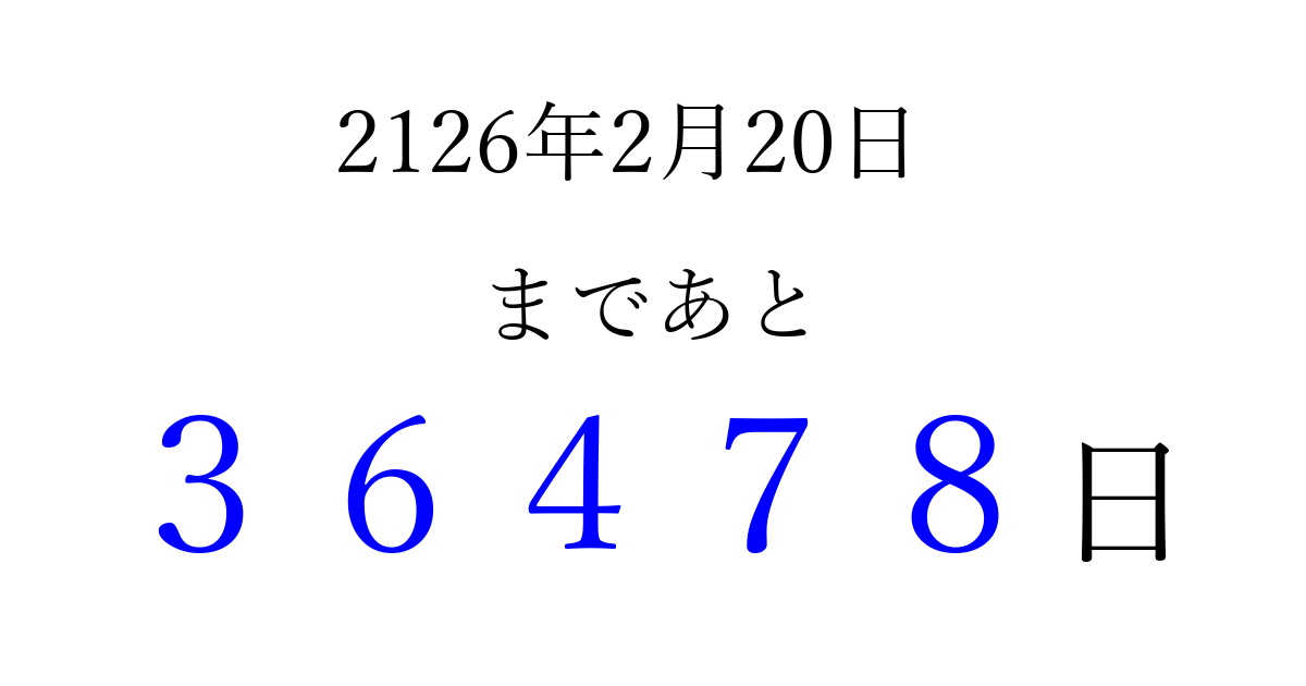 2126年2月20日(水)まで あと 99999 日です 追加すると、トップページからすぐ選べるようになります ※2026/04/07現在の結果です。 最新の状態に更新する ↓シェアして、タイムライン上にカウントダウンを表示しよう!↓ 📤 この結果を共有する Tweet シェア Threads Bluesky 別の日付でカウントダウン 2126年2月のカレンダー このページをブックマークに追加すると、いつでもカウントダウンを確認できます。 (PC: Ctrl+D / Mac: ⌘+D) hitome-notes.comでは以下のページも運営しています。 指定日と期間から日付を計算 | ガチャ確率計算・シミュレーション | プライバシー・ポリシー 運営者:Avocado