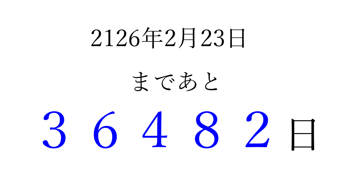 2126年2月23日(土)まで あと 99999 日です 追加すると、トップページからすぐ選べるようになります ※2026/04/06現在の結果です。 最新の状態に更新する ↓シェアして、タイムライン上にカウントダウンを表示しよう!↓ 📤 この結果を共有する Tweet シェア Threads Bluesky 別の日付でカウントダウン 2126年2月のカレンダー このページをブックマークに追加すると、いつでもカウントダウンを確認できます。 (PC: Ctrl+D / Mac: ⌘+D) hitome-notes.comでは以下のページも運営しています。 指定日と期間から日付を計算 | ガチャ確率計算・シミュレーション | プライバシー・ポリシー 運営者:Avocado
