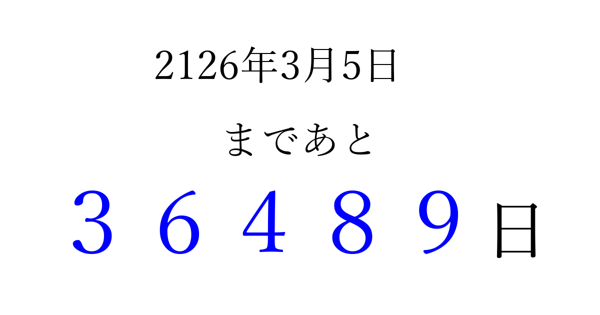 2126年3月5日(火)まで あと 99999 日です 追加すると、トップページからすぐ選べるようになります ※2026/04/09現在の結果です。 最新の状態に更新する ↓シェアして、タイムライン上にカウントダウンを表示しよう!↓ 📤 この結果を共有する Tweet シェア Threads Bluesky 別の日付でカウントダウン 2126年3月のカレンダー このページをブックマークに追加すると、いつでもカウントダウンを確認できます。 (PC: Ctrl+D / Mac: ⌘+D) hitome-notes.comでは以下のページも運営しています。 指定日と期間から日付を計算 | ガチャ確率計算・シミュレーション | プライバシー・ポリシー 運営者:Avocado
