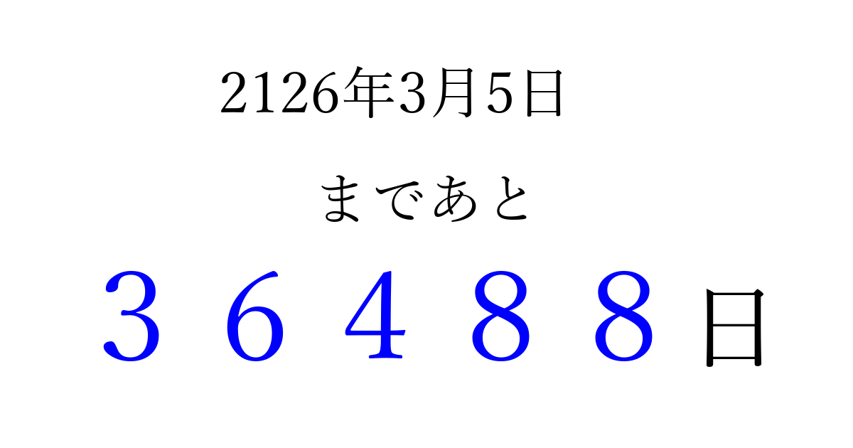 2126年3月5日(火)まで あと 99999 日です 追加すると、トップページからすぐ選べるようになります ※2026/04/10現在の結果です。 最新の状態に更新する ↓シェアして、タイムライン上にカウントダウンを表示しよう!↓ 📤 この結果を共有する Tweet シェア Threads Bluesky 別の日付でカウントダウン 2126年3月のカレンダー このページをブックマークに追加すると、いつでもカウントダウンを確認できます。 (PC: Ctrl+D / Mac: ⌘+D) hitome-notes.comでは以下のページも運営しています。 指定日と期間から日付を計算 | ガチャ確率計算・シミュレーション | プライバシー・ポリシー 運営者:Avocado