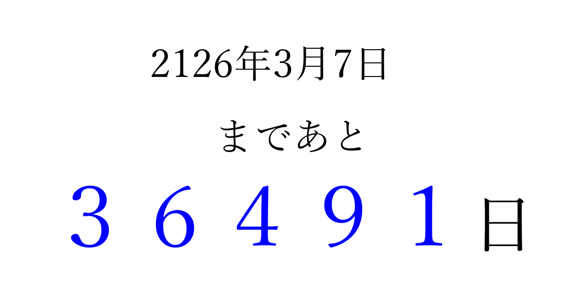 2126年3月7日(木)まで あと 99999 日です 追加すると、トップページからすぐ選べるようになります ※2026/04/09現在の結果です。 最新の状態に更新する ↓シェアして、タイムライン上にカウントダウンを表示しよう!↓ 📤 この結果を共有する Tweet シェア Threads Bluesky 別の日付でカウントダウン 2126年3月のカレンダー このページをブックマークに追加すると、いつでもカウントダウンを確認できます。 (PC: Ctrl+D / Mac: ⌘+D) hitome-notes.comでは以下のページも運営しています。 指定日と期間から日付を計算 | ガチャ確率計算・シミュレーション | プライバシー・ポリシー 運営者:Avocado