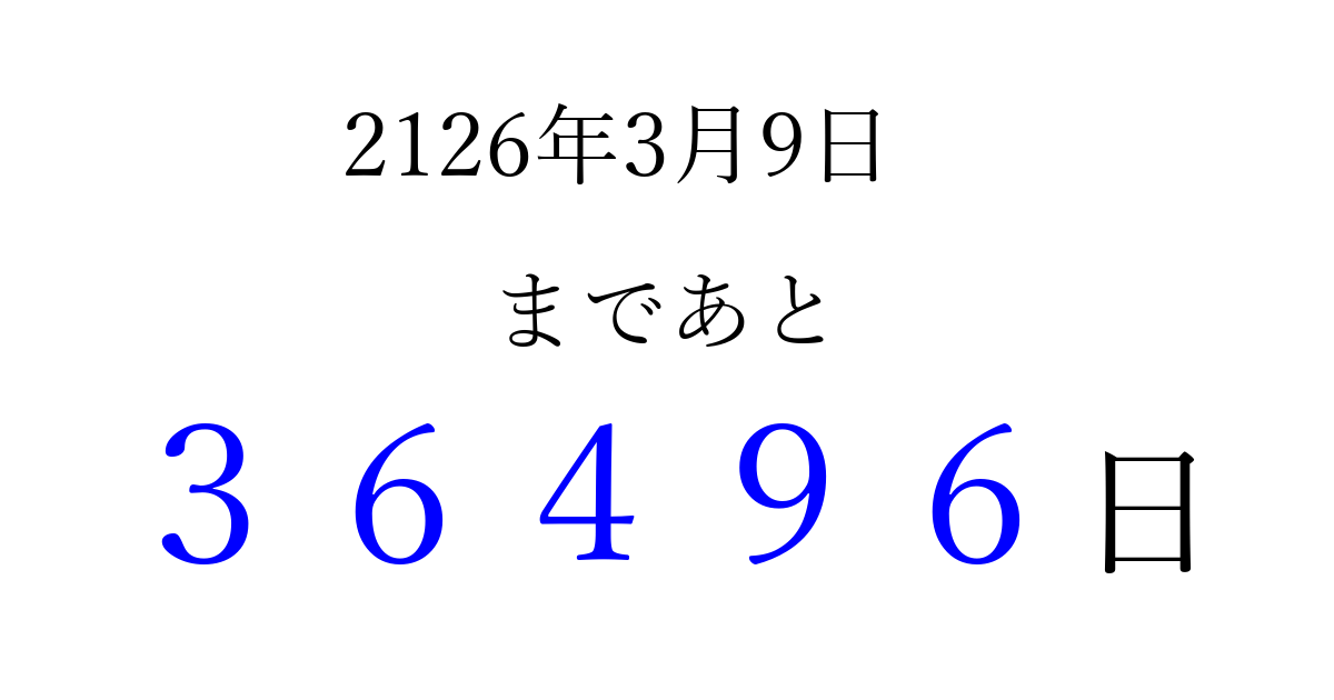 2126年3月9日(土)まで あと 99999 日です 追加すると、トップページからすぐ選べるようになります ※2026/04/06現在の結果です。 最新の状態に更新する ↓シェアして、タイムライン上にカウントダウンを表示しよう!↓ 📤 この結果を共有する Tweet シェア Threads Bluesky 別の日付でカウントダウン 2126年3月のカレンダー このページをブックマークに追加すると、いつでもカウントダウンを確認できます。 (PC: Ctrl+D / Mac: ⌘+D) hitome-notes.comでは以下のページも運営しています。 指定日と期間から日付を計算 | ガチャ確率計算・シミュレーション | プライバシー・ポリシー 運営者:Avocado