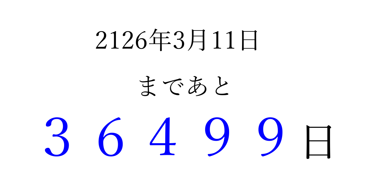 2126年3月11日(月)まで あと 99999 日です 追加すると、トップページからすぐ選べるようになります ※2026/04/05現在の結果です。 最新の状態に更新する ↓シェアして、タイムライン上にカウントダウンを表示しよう!↓ 📤 この結果を共有する Tweet シェア Threads Bluesky 別の日付でカウントダウン 2126年3月のカレンダー このページをブックマークに追加すると、いつでもカウントダウンを確認できます。 (PC: Ctrl+D / Mac: ⌘+D) hitome-notes.comでは以下のページも運営しています。 指定日と期間から日付を計算 | ガチャ確率計算・シミュレーション | プライバシー・ポリシー 運営者:Avocado