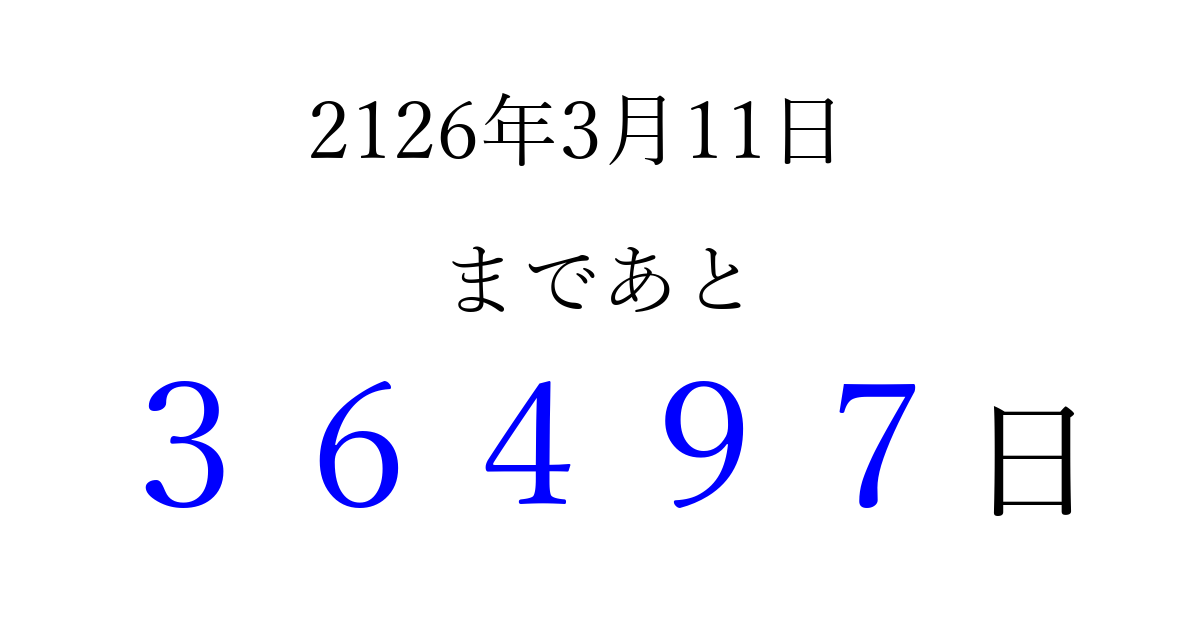 2126年3月11日(月)まで あと 99999 日です 追加すると、トップページからすぐ選べるようになります ※2026/04/07現在の結果です。 最新の状態に更新する ↓シェアして、タイムライン上にカウントダウンを表示しよう!↓ 📤 この結果を共有する Tweet シェア Threads Bluesky 別の日付でカウントダウン 2126年3月のカレンダー このページをブックマークに追加すると、いつでもカウントダウンを確認できます。 (PC: Ctrl+D / Mac: ⌘+D) hitome-notes.comでは以下のページも運営しています。 指定日と期間から日付を計算 | ガチャ確率計算・シミュレーション | プライバシー・ポリシー 運営者:Avocado