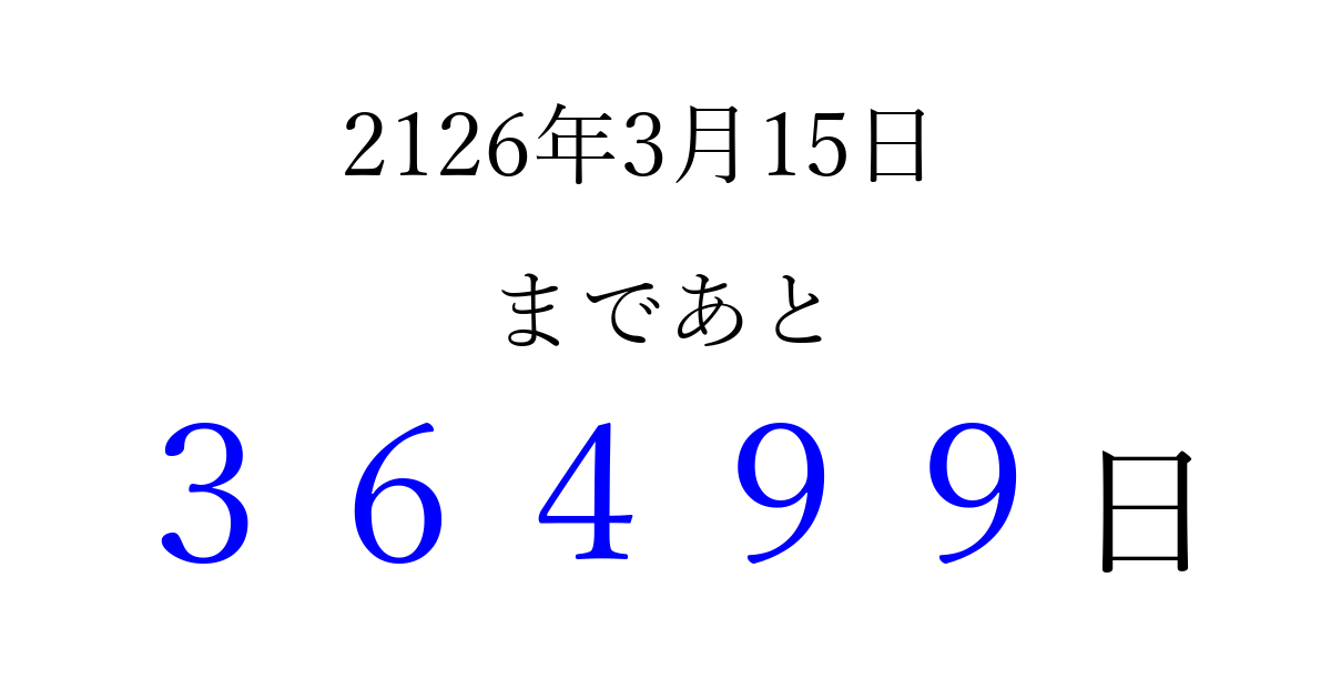 2126年3月15日(金)まで あと 99999 日です 追加すると、トップページからすぐ選べるようになります ※2026/04/09現在の結果です。 最新の状態に更新する ↓シェアして、タイムライン上にカウントダウンを表示しよう!↓ 📤 この結果を共有する Tweet シェア Threads Bluesky 別の日付でカウントダウン 2126年3月のカレンダー このページをブックマークに追加すると、いつでもカウントダウンを確認できます。 (PC: Ctrl+D / Mac: ⌘+D) hitome-notes.comでは以下のページも運営しています。 指定日と期間から日付を計算 | ガチャ確率計算・シミュレーション | プライバシー・ポリシー 運営者:Avocado