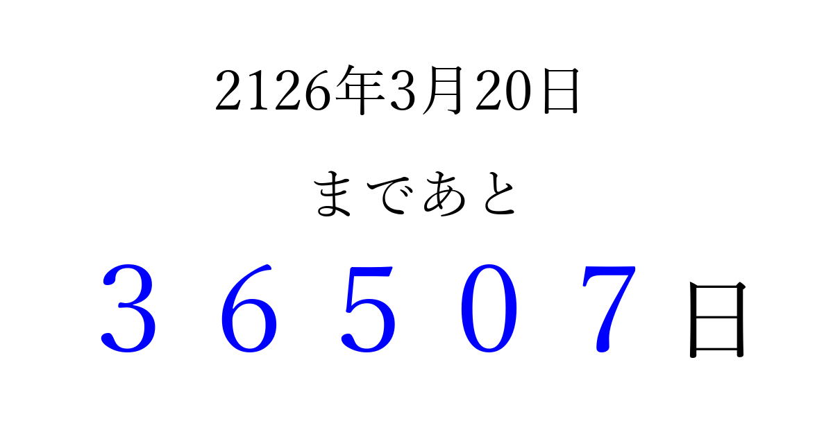 2126年3月20日(水)まで あと 99999 日です 追加すると、トップページからすぐ選べるようになります ※2026/04/06現在の結果です。 最新の状態に更新する ↓シェアして、タイムライン上にカウントダウンを表示しよう!↓ 📤 この結果を共有する Tweet シェア Threads Bluesky 別の日付でカウントダウン 2126年3月のカレンダー このページをブックマークに追加すると、いつでもカウントダウンを確認できます。 (PC: Ctrl+D / Mac: ⌘+D) hitome-notes.comでは以下のページも運営しています。 指定日と期間から日付を計算 | ガチャ確率計算・シミュレーション | プライバシー・ポリシー 運営者:Avocado