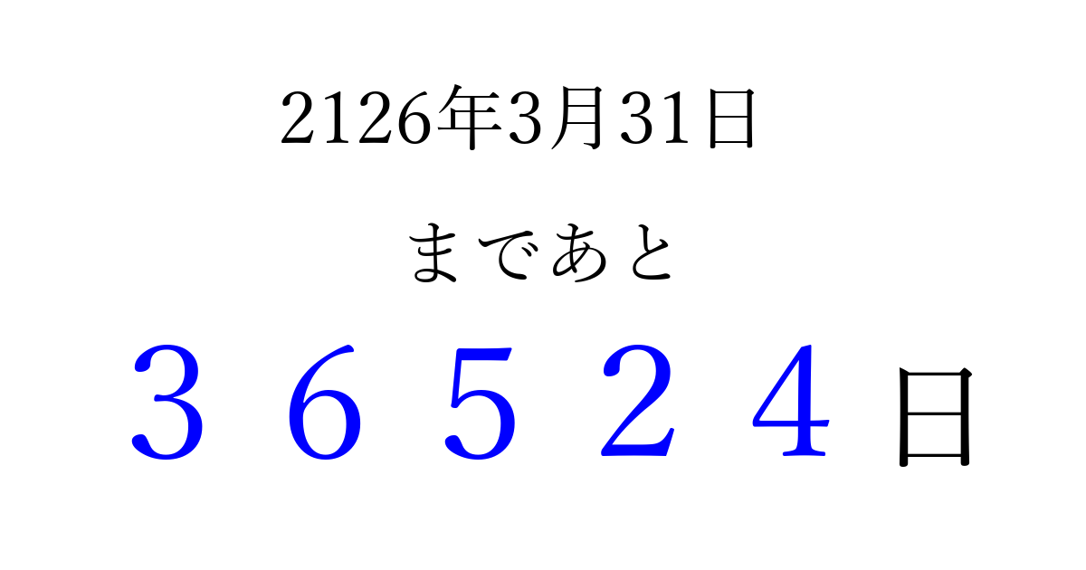 2126年3月31日(日)まで あと 99999 日です 追加すると、トップページからすぐ選べるようになります ※2026/03/31現在の結果です。 最新の状態に更新する ↓シェアして、タイムライン上にカウントダウンを表示しよう!↓ 📤 この結果を共有する Tweet シェア Threads Bluesky 別の日付でカウントダウン 2126年3月のカレンダー このページをブックマークに追加すると、いつでもカウントダウンを確認できます。 (PC: Ctrl+D / Mac: ⌘+D) hitome-notes.comでは以下のページも運営しています。 指定日と期間から日付を計算 | ガチャ確率計算・シミュレーション | プライバシー・ポリシー 運営者:Avocado