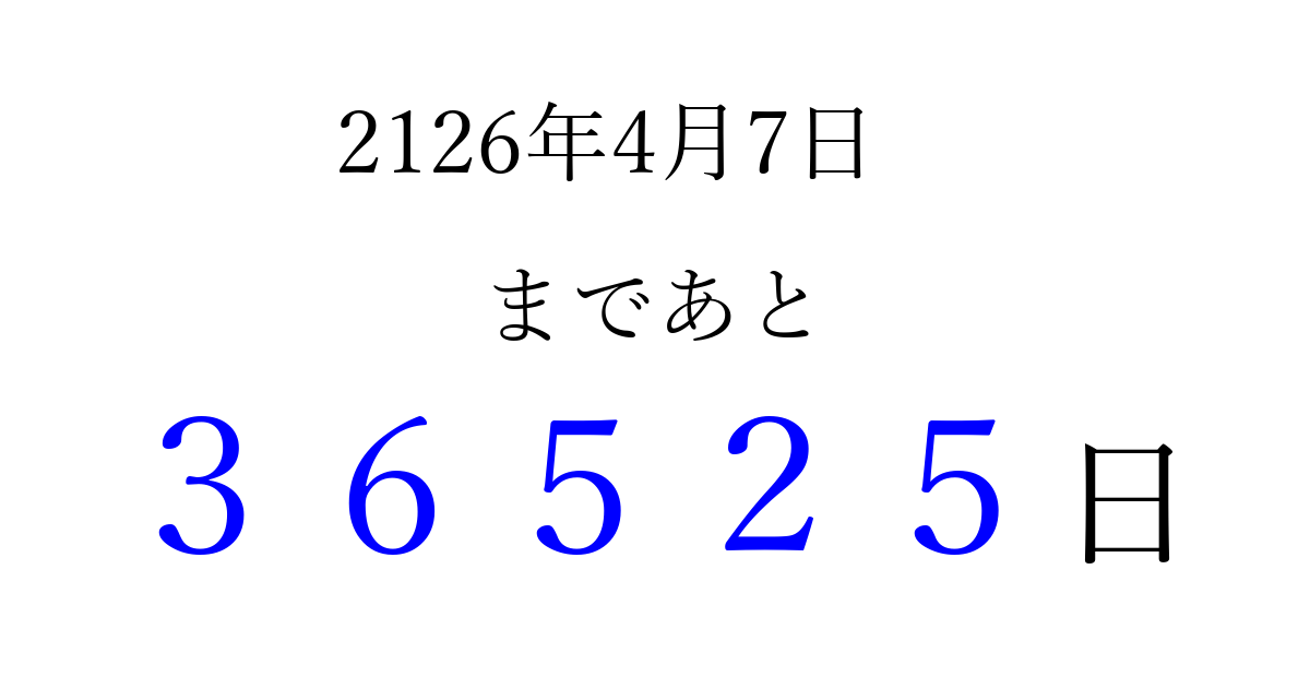2126年4月7日(日)まで あと 99999 日です 追加すると、トップページからすぐ選べるようになります ※2026/04/06現在の結果です。 最新の状態に更新する ↓シェアして、タイムライン上にカウントダウンを表示しよう!↓ 📤 この結果を共有する Tweet シェア Threads Bluesky 別の日付でカウントダウン 2126年4月のカレンダー このページをブックマークに追加すると、いつでもカウントダウンを確認できます。 (PC: Ctrl+D / Mac: ⌘+D) hitome-notes.comでは以下のページも運営しています。 指定日と期間から日付を計算 | ガチャ確率計算・シミュレーション | プライバシー・ポリシー 運営者:Avocado