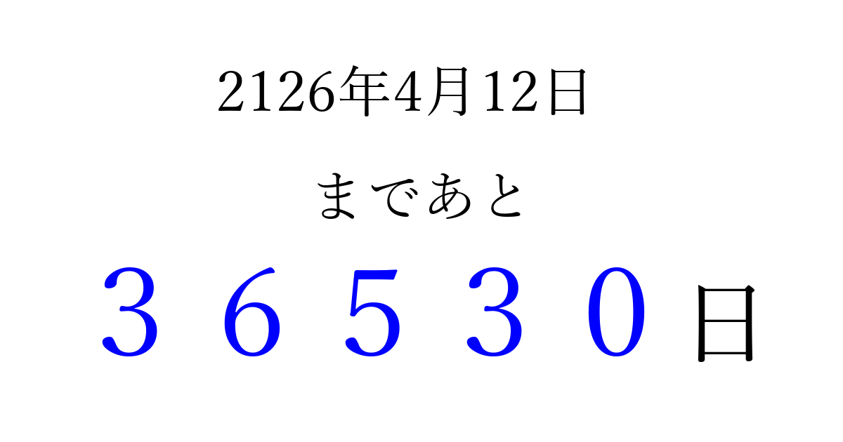 2126年4月12日(金)まで あと 99999 日です 追加すると、トップページからすぐ選べるようになります ※2026/04/06現在の結果です。 最新の状態に更新する ↓シェアして、タイムライン上にカウントダウンを表示しよう!↓ 📤 この結果を共有する Tweet シェア Threads Bluesky 別の日付でカウントダウン 2126年4月のカレンダー このページをブックマークに追加すると、いつでもカウントダウンを確認できます。 (PC: Ctrl+D / Mac: ⌘+D) hitome-notes.comでは以下のページも運営しています。 指定日と期間から日付を計算 | ガチャ確率計算・シミュレーション | プライバシー・ポリシー 運営者:Avocado