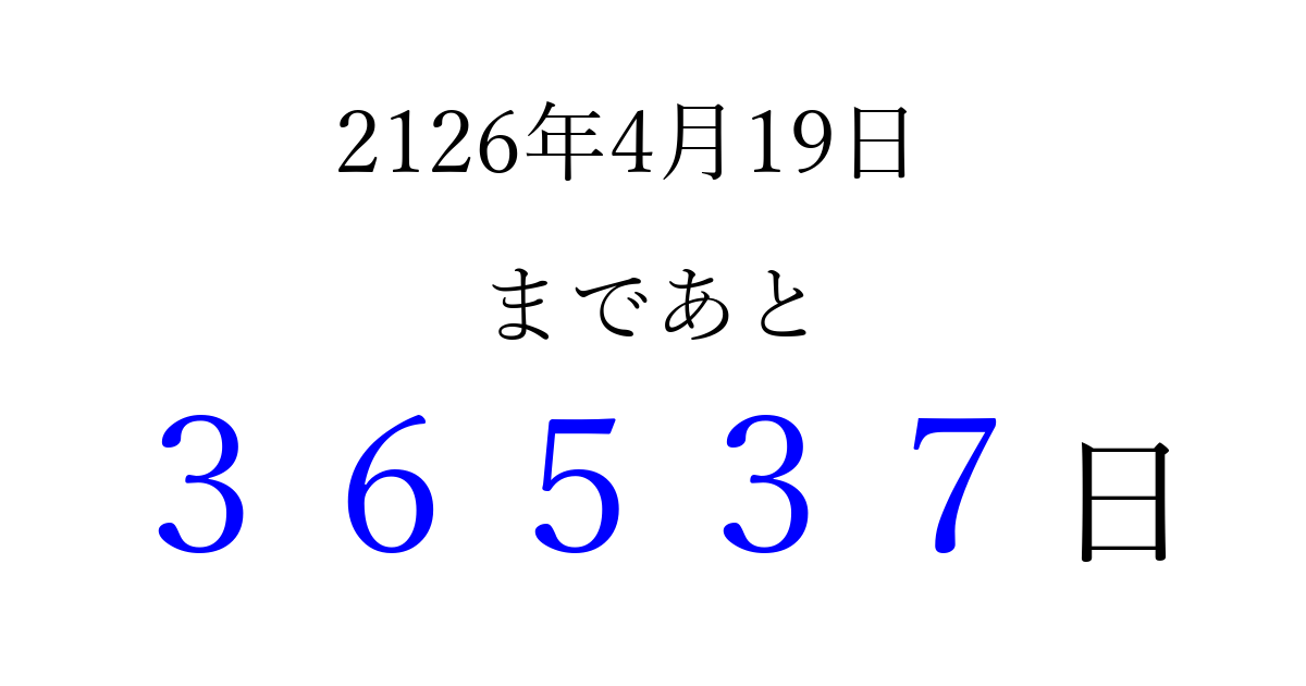 2126年4月19日(金)まで あと 99999 日です 追加すると、トップページからすぐ選べるようになります ※2026/04/06現在の結果です。 最新の状態に更新する ↓シェアして、タイムライン上にカウントダウンを表示しよう!↓ 📤 この結果を共有する Tweet シェア Threads Bluesky 別の日付でカウントダウン 2126年4月のカレンダー このページをブックマークに追加すると、いつでもカウントダウンを確認できます。 (PC: Ctrl+D / Mac: ⌘+D) hitome-notes.comでは以下のページも運営しています。 指定日と期間から日付を計算 | ガチャ確率計算・シミュレーション | プライバシー・ポリシー 運営者:Avocado