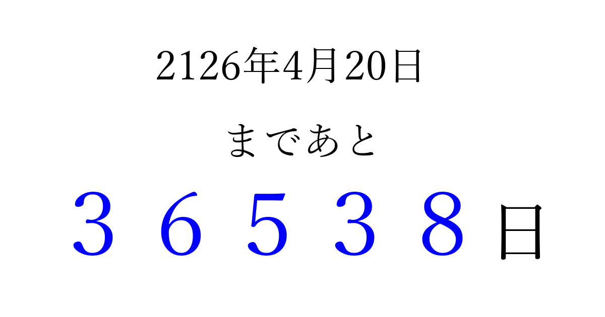 2126年4月20日(土)まで あと 99999 日です 追加すると、トップページからすぐ選べるようになります ※2026/04/06現在の結果です。 最新の状態に更新する ↓シェアして、タイムライン上にカウントダウンを表示しよう!↓ 📤 この結果を共有する Tweet シェア Threads Bluesky 別の日付でカウントダウン 2126年4月のカレンダー このページをブックマークに追加すると、いつでもカウントダウンを確認できます。 (PC: Ctrl+D / Mac: ⌘+D) hitome-notes.comでは以下のページも運営しています。 指定日と期間から日付を計算 | ガチャ確率計算・シミュレーション | プライバシー・ポリシー 運営者:Avocado