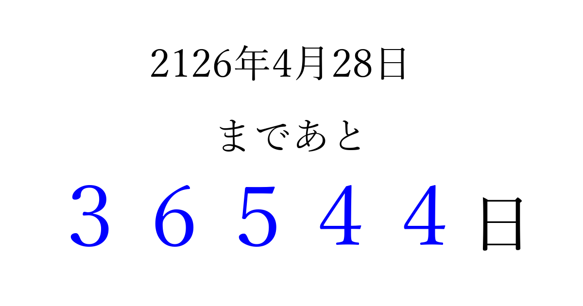 2126年4月28日(日)まで あと 99999 日です 追加すると、トップページからすぐ選べるようになります ※2026/04/08現在の結果です。 最新の状態に更新する ↓シェアして、タイムライン上にカウントダウンを表示しよう!↓ 📤 この結果を共有する Tweet シェア Threads Bluesky 別の日付でカウントダウン 2126年4月のカレンダー このページをブックマークに追加すると、いつでもカウントダウンを確認できます。 (PC: Ctrl+D / Mac: ⌘+D) hitome-notes.comでは以下のページも運営しています。 指定日と期間から日付を計算 | ガチャ確率計算・シミュレーション | プライバシー・ポリシー 運営者:Avocado