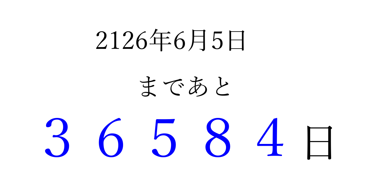 2126年6月5日(水)まで あと 99999 日です 追加すると、トップページからすぐ選べるようになります ※2026/04/06現在の結果です。 最新の状態に更新する ↓シェアして、タイムライン上にカウントダウンを表示しよう!↓ 📤 この結果を共有する Tweet シェア Threads Bluesky 別の日付でカウントダウン 2126年6月のカレンダー このページをブックマークに追加すると、いつでもカウントダウンを確認できます。 (PC: Ctrl+D / Mac: ⌘+D) hitome-notes.comでは以下のページも運営しています。 指定日と期間から日付を計算 | ガチャ確率計算・シミュレーション | プライバシー・ポリシー 運営者:Avocado
