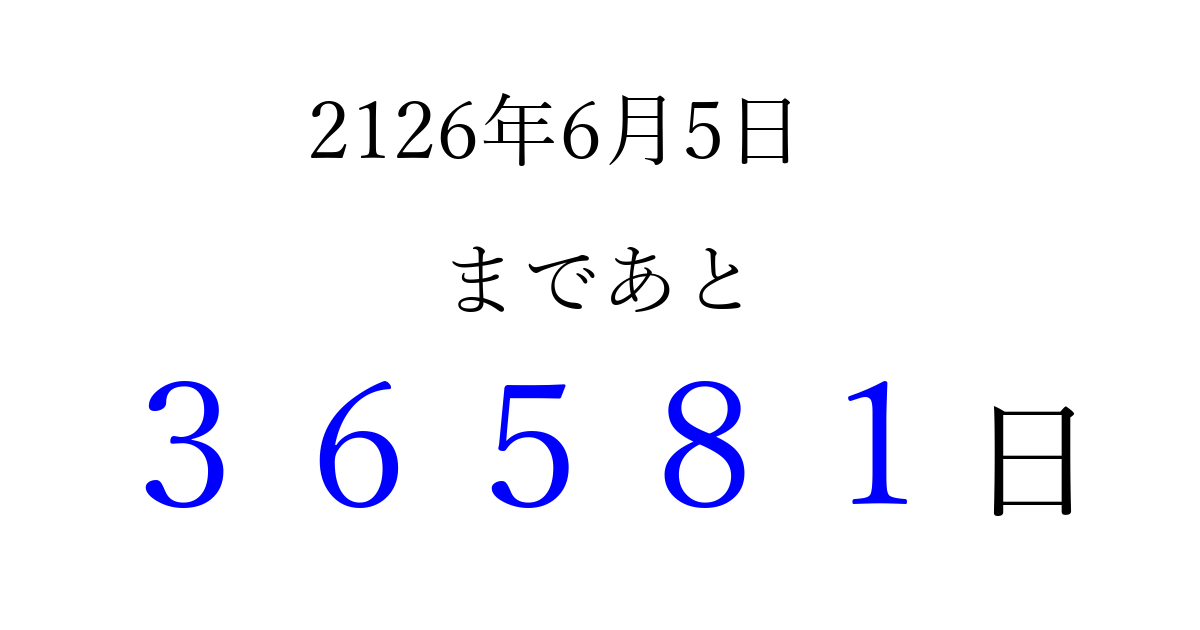2126年6月5日(水)まで あと 99999 日です 追加すると、トップページからすぐ選べるようになります ※2026/04/09現在の結果です。 最新の状態に更新する ↓シェアして、タイムライン上にカウントダウンを表示しよう!↓ 📤 この結果を共有する Tweet シェア Threads Bluesky 別の日付でカウントダウン 2126年6月のカレンダー このページをブックマークに追加すると、いつでもカウントダウンを確認できます。 (PC: Ctrl+D / Mac: ⌘+D) hitome-notes.comでは以下のページも運営しています。 指定日と期間から日付を計算 | ガチャ確率計算・シミュレーション | プライバシー・ポリシー 運営者:Avocado