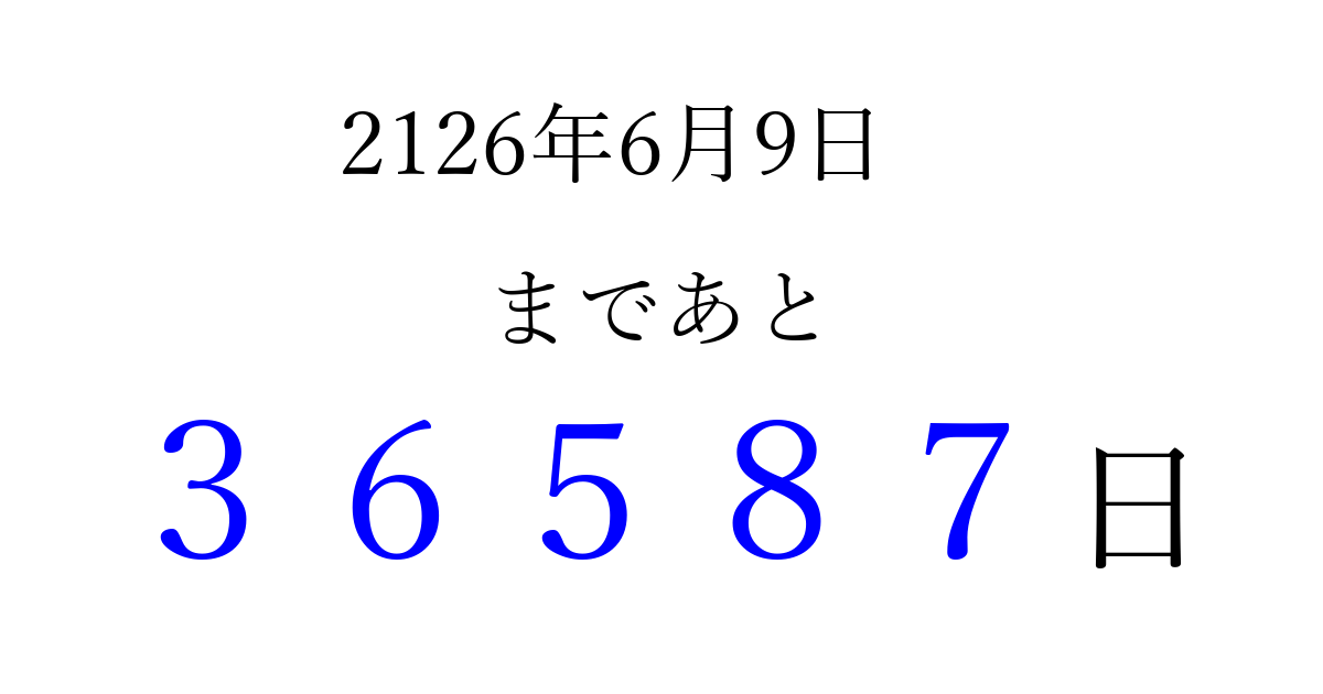 2126年6月9日(日)まで あと 99999 日です 追加すると、トップページからすぐ選べるようになります ※2026/04/07現在の結果です。 最新の状態に更新する ↓シェアして、タイムライン上にカウントダウンを表示しよう!↓ 📤 この結果を共有する Tweet シェア Threads Bluesky 別の日付でカウントダウン 2126年6月のカレンダー このページをブックマークに追加すると、いつでもカウントダウンを確認できます。 (PC: Ctrl+D / Mac: ⌘+D) hitome-notes.comでは以下のページも運営しています。 指定日と期間から日付を計算 | ガチャ確率計算・シミュレーション | プライバシー・ポリシー 運営者:Avocado