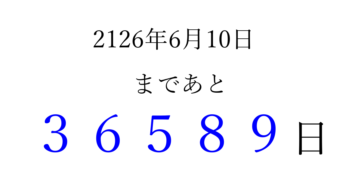 2126年6月10日(月)まで あと 99999 日です 追加すると、トップページからすぐ選べるようになります ※2026/04/06現在の結果です。 最新の状態に更新する ↓シェアして、タイムライン上にカウントダウンを表示しよう!↓ 📤 この結果を共有する Tweet シェア Threads Bluesky 別の日付でカウントダウン 2126年6月のカレンダー このページをブックマークに追加すると、いつでもカウントダウンを確認できます。 (PC: Ctrl+D / Mac: ⌘+D) hitome-notes.comでは以下のページも運営しています。 指定日と期間から日付を計算 | ガチャ確率計算・シミュレーション | プライバシー・ポリシー 運営者:Avocado