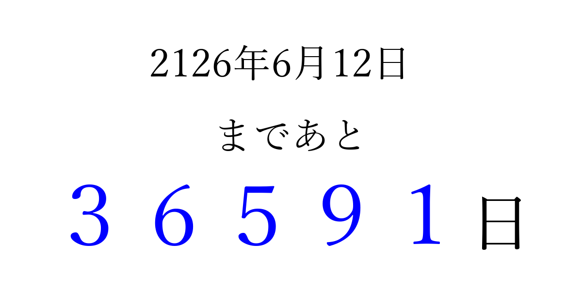 2126年6月12日(水)まで あと 99999 日です 追加すると、トップページからすぐ選べるようになります ※2026/04/06現在の結果です。 最新の状態に更新する ↓シェアして、タイムライン上にカウントダウンを表示しよう!↓ 📤 この結果を共有する Tweet シェア Threads Bluesky 別の日付でカウントダウン 2126年6月のカレンダー このページをブックマークに追加すると、いつでもカウントダウンを確認できます。 (PC: Ctrl+D / Mac: ⌘+D) hitome-notes.comでは以下のページも運営しています。 指定日と期間から日付を計算 | ガチャ確率計算・シミュレーション | プライバシー・ポリシー 運営者:Avocado